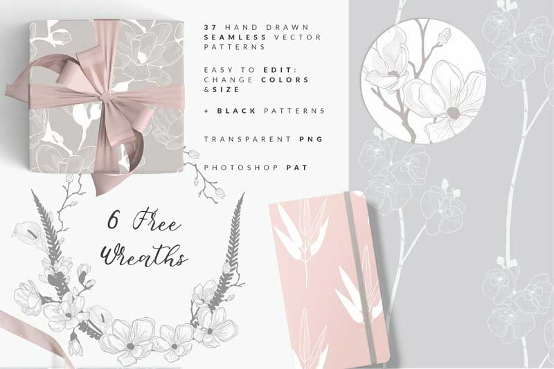 Introduce the new very elegant Des Fleurs collection of 35+ Floristic Seamless Vector Patterns + 8 Instagram Templates + 6 Free Bonus Hand Drawn Wreaths. I hope you will love it!