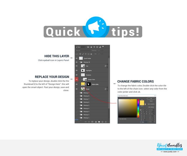 It’s very easy and simple to edit and customize mockup’s colors, background and replace your design. Watch provides a full video of how to edit and customize t-shirt mockups.